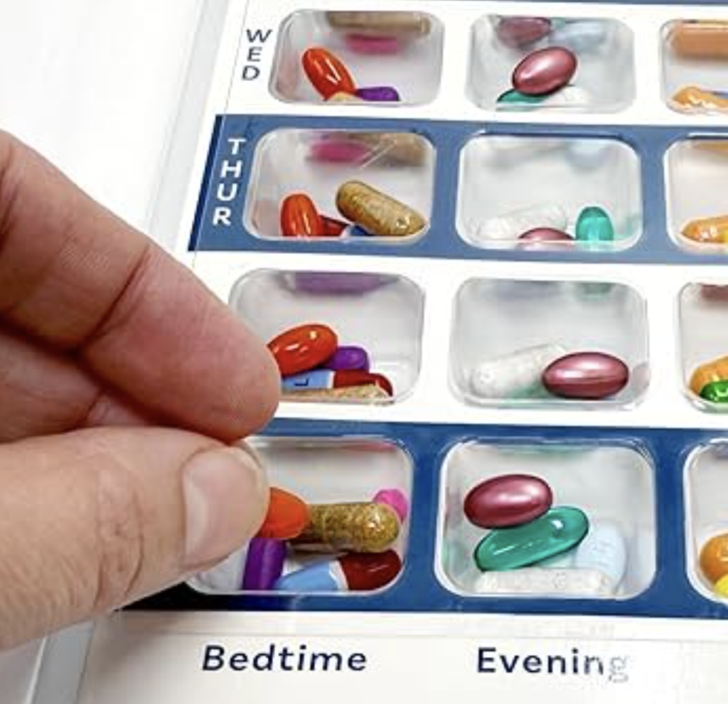 Medicines are arranged by day and time (morning, noon, evening, night). - Improved medication safety
